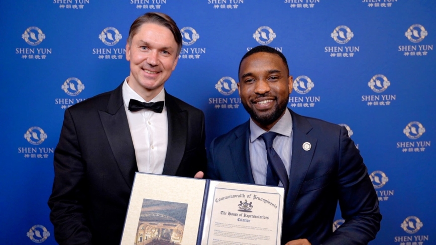 「賓夕法尼亞州眾議院向神韻藝術團致敬,感謝其卓越的舞蹈和音樂演出,以及其在費城和全球促進文化理解、復興中國傳統文化和追求藝術卓越的堅定奉獻。我們還向大費城法輪大法協會的志願者表達誠摯的感謝,感謝他們不懈的努力,讓大費城的居民再次與神韻見面,使當地觀眾能親身體驗神韻展現給全世界的精美藝術和深厚文化內涵。」