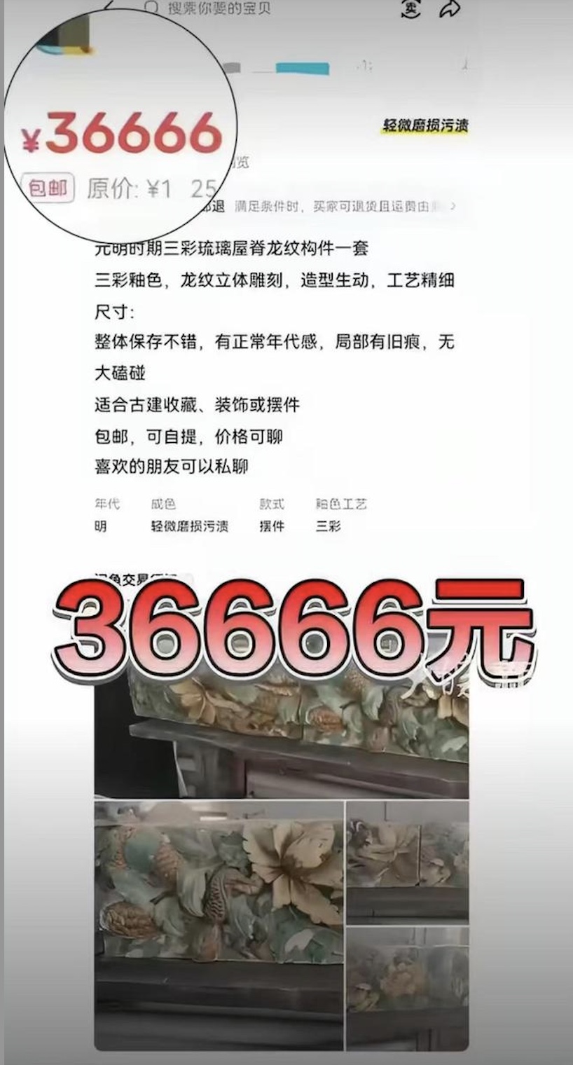 涉事店鋪在閒魚平台對其售賣產品信息描述為,「元明時期三彩琉璃屋脊龍紋構件一套三彩釉色,標價36666元。龍紋立體雕刻,造型生動,工藝精細。整體保存不錯,適合古建收藏、裝飾或擺件。」