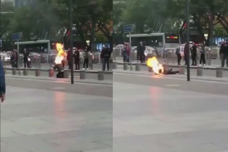 事发于10月17日,在毗邻北京天安门广场的西单大悦城旁边,一名身穿厚衣的男子上身突然起火并随之倒在地上,估计是疼痛的缘故,男子的两脚踢打着地面。