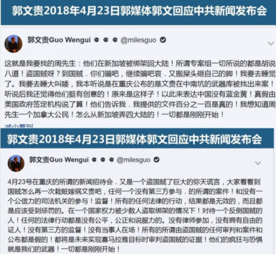 中国富商郭文贵发表公开回应,指中共重庆市公安局4月23日发布的有关伪造机密文件的指控是“栽赃嫁祸”。(网络截图)