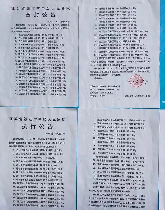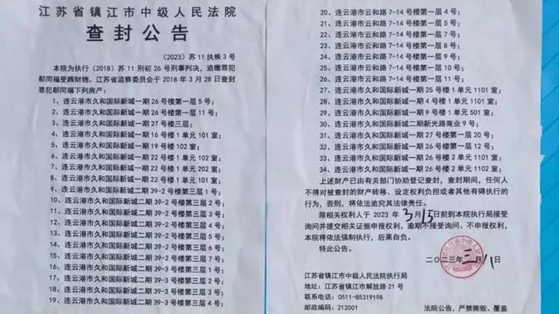 日前网上热传江苏省镇江市中级法院3月8日发布的一份查封公告和一份执行公告,内容是为执行2018年的一项刑事判决,对罪犯郗同福受贿所得的34套房产进行查封,并要求入住人员在15日迁出。