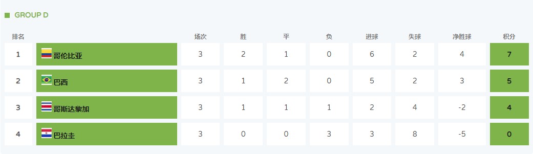 至此,美洲杯D组小组赛落幕,哥伦比亚积7分居首,淘汰赛将与巴拿马争夺一个半决赛席位;而巴西积5分紧随其后,将与乌拉圭狭路相逢。