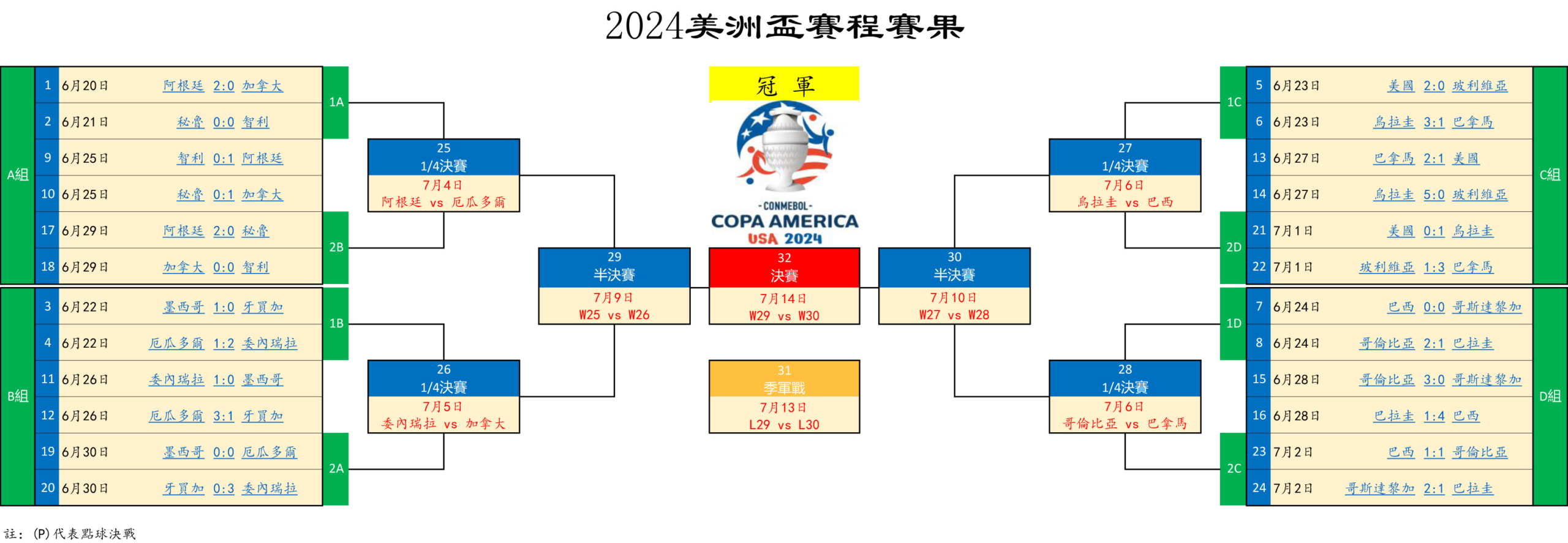 本届杯赛八强全部产生,淘汰赛将于7月4日至6日举行,具体对阵是:上半区,阿根廷VS厄瓜多尔、委内瑞拉VS加拿大;下半区,哥伦比亚VS巴拿马、巴西VS乌拉圭。