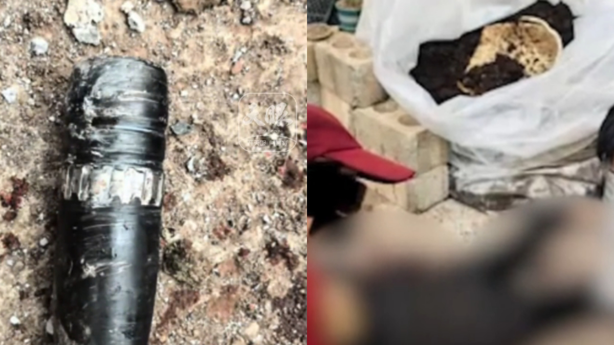 网传的视频显示,当时有两个人正在院子里干活,突然“砰”的一声巨响,地面腾起灰尘。接着视频显示,有人被砸伤,倒在地上,坠落物是黑色金属管状物体,旁边地上有血迹。该疑似炮弹的物体从农户厨房顶部砸进室内。