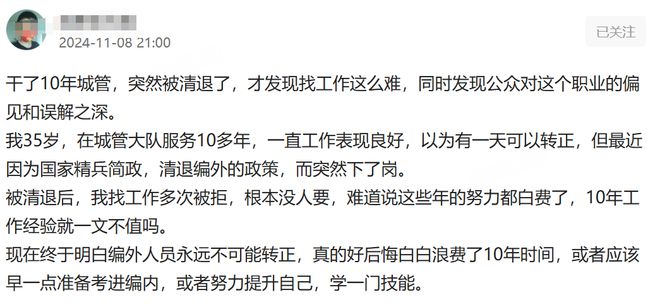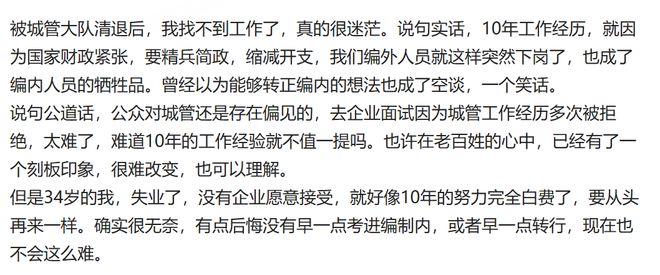 这位网民称,自己35岁,在城管大队工作了十年,原以为可以转正,但是最近因为城管大队清退编外人员而失业了。他说,“现在终于明白编外人员永远不可能转正,真的好后悔白白浪费了10年时间。”