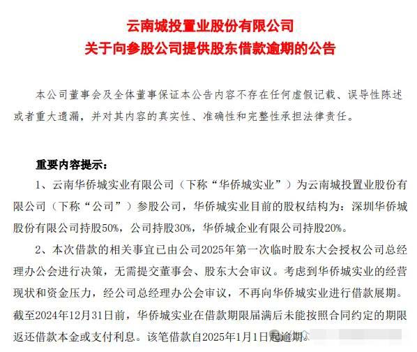 1月3日,云南城投置业股份有限公司发布公告称,此前公司陆续向云南华侨城实业有限公司(下称华侨城实业)提供借款,截至2020年12月借款本金余额4200.69万元(人民币,下同)。自2020年至2024年,公司每年对华侨城实业提供的借款进行展期,到期日为2024年12月31日。华侨城实业无法按期偿还上述借款及利息,于2025年1月1日起逾期。