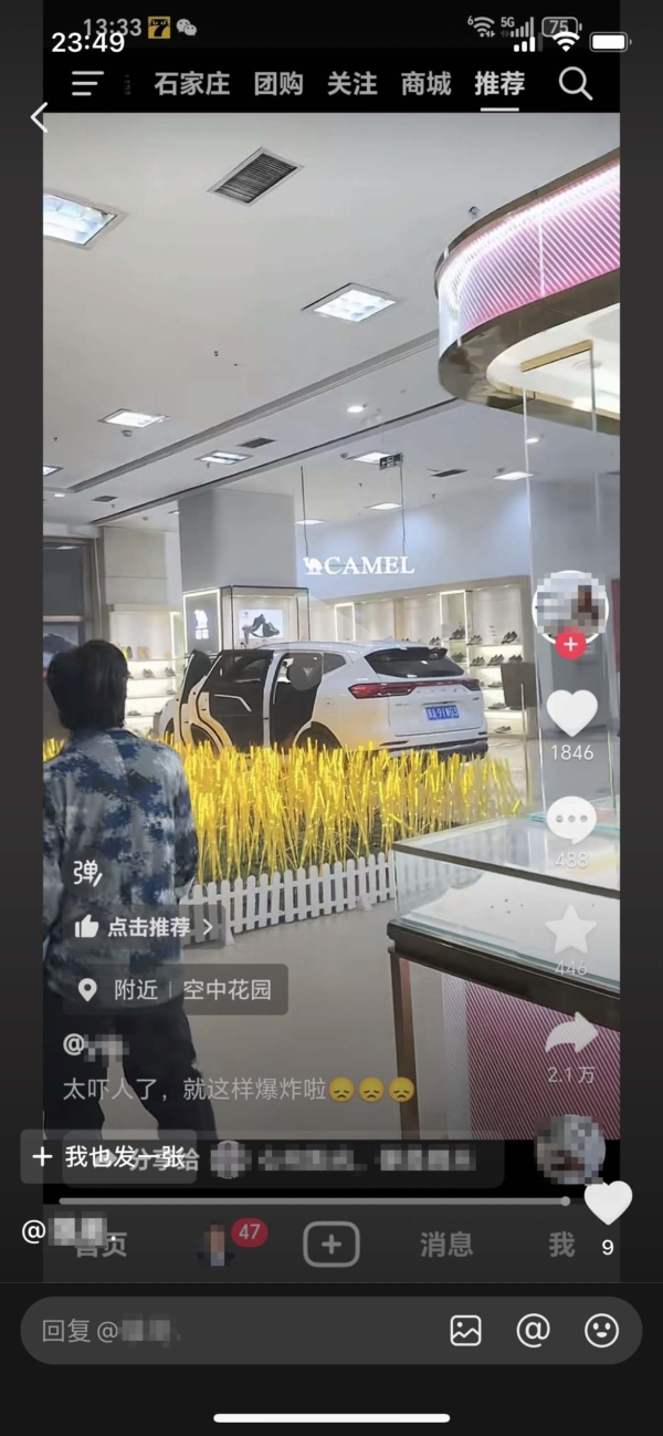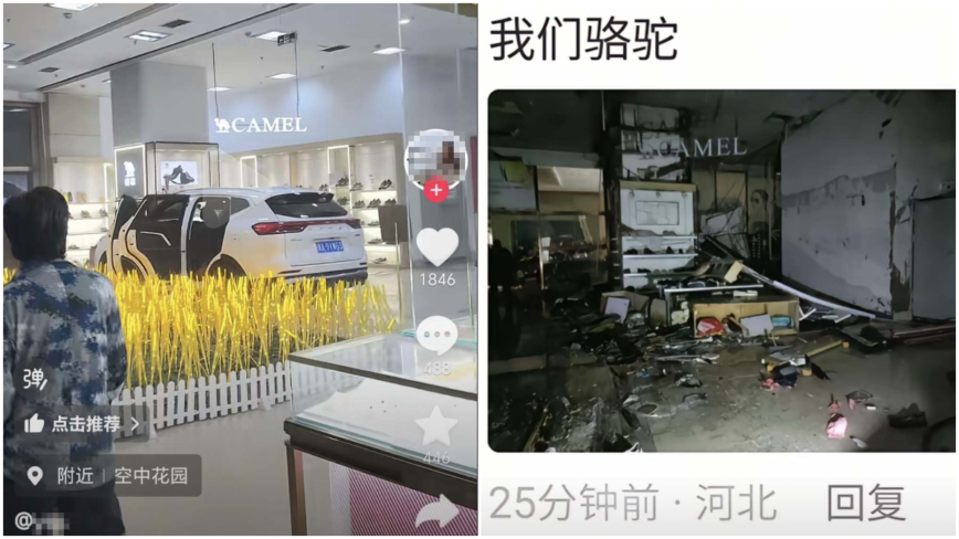 一张截图显示,一辆白色轿车竟然开进了商场大厅内,停在一家名为“骆驼”(Camel)的鞋店前,车门大开,车内似乎看不到乘客。另一张截图显示,疑似一名保安到车前查看。