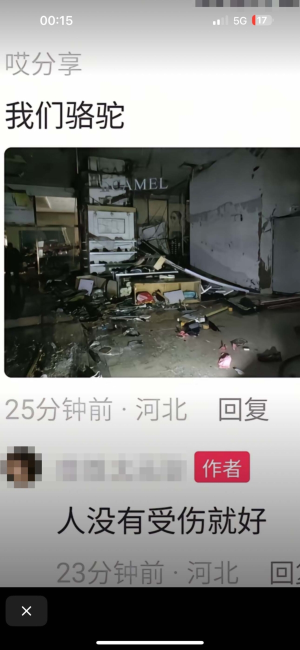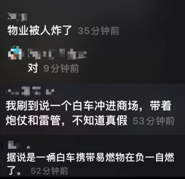 目前中共官方未通报此事,疑似旨在“维稳”。当地网民传出各种消息。有人说,是有业主报复物业,把物业办公室给炸了。还有人说,一辆白车携带易燃物,在大楼负一层燃爆。也有网民说,自己刷到视频,看到一辆白车拉着烟花爆竹和雷管,冲进了商场。