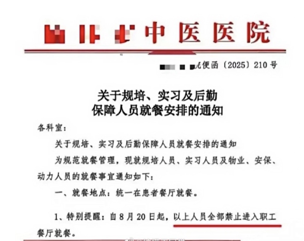 网传榆林市中医医院一份《关于规培、实习及后勤保障人员就餐安排的通知》中写道,“为规范就餐管理,自8月20日起,规培人员、实习人员及物业、安保、动力人员统一在患者餐厅就餐,以上人员全部禁止进入职工餐厅。”