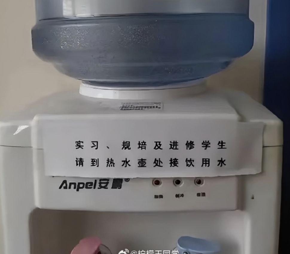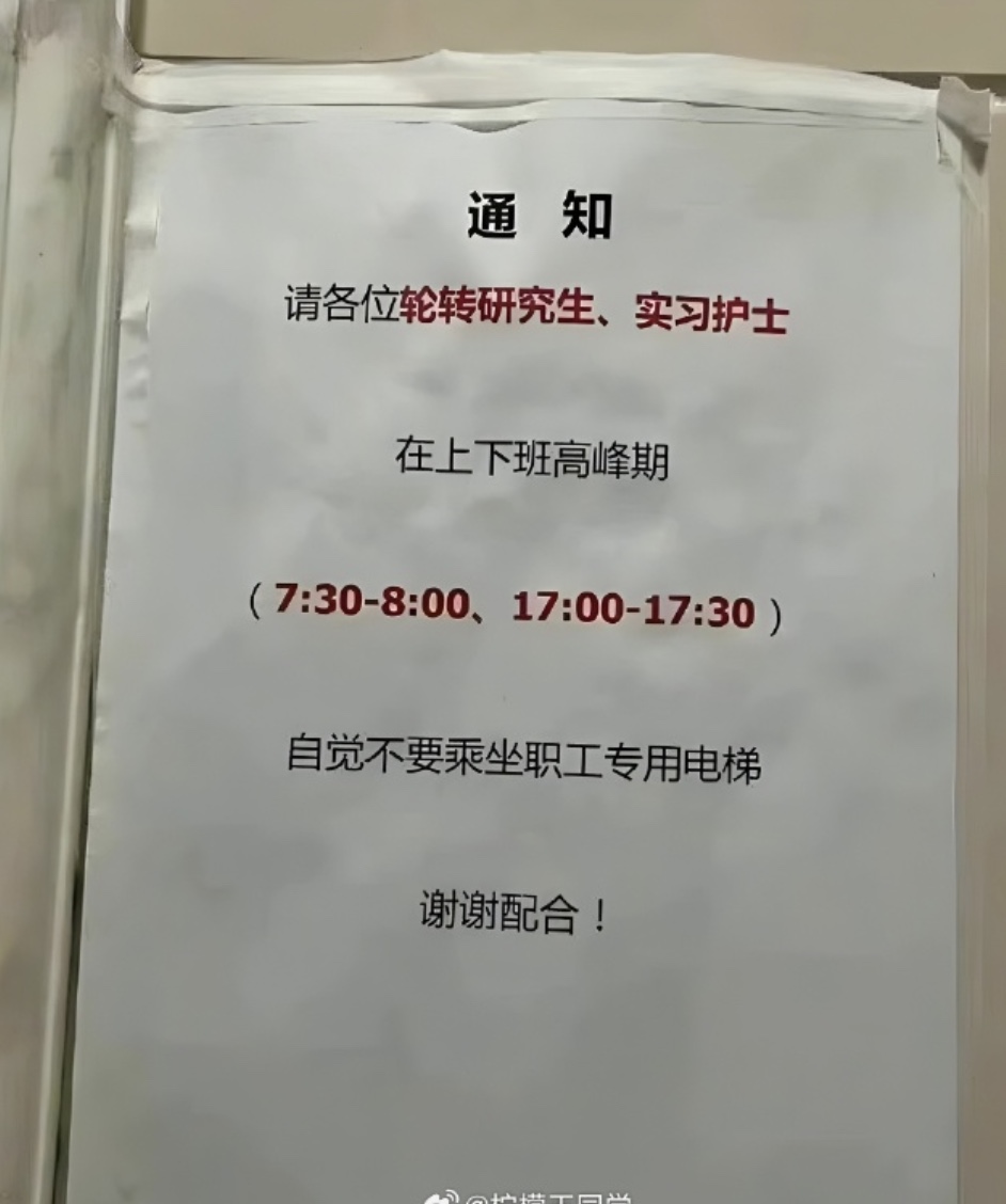 有网友贴出图片显示其它医院的规定:“各位轮转研究生、实习护士,在上下班高峰,自觉不要乘坐职工专用电梯”“实习、规培及进修学生请到热水壶处接饮用水”。