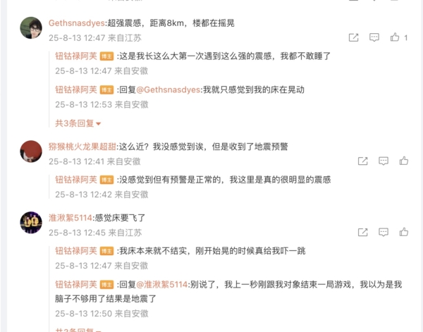 当地网友在社交平台发帖称,“当时整个屋子一震,我以为房顶塌了呢,原来是地震了”“吓死我了,听动静跟打雷一样,结果我妈说地震”“震感超强”“感觉床要飞”“门窗剧烈抖动”。