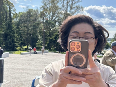 梁和他的妻子在赫尔辛基西贝柳斯公园询问法轮功学员的个人信息,并拍摄学员的个别照片。