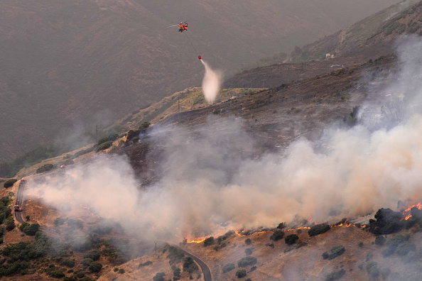 2025年8月16日,一架直升机在西班牙西北部卡斯特里略·德卡布雷拉扑灭野火。(CESAR MANSO/AFP via Getty Images)