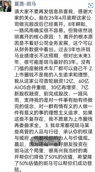 夏莲在贴文中透露,自己已在25年4月底离开斑马网络。她直言,自己不看好这家公司的业务发展,因为“没有技术门槛的座舱,技术车厂都可以自己干”。
