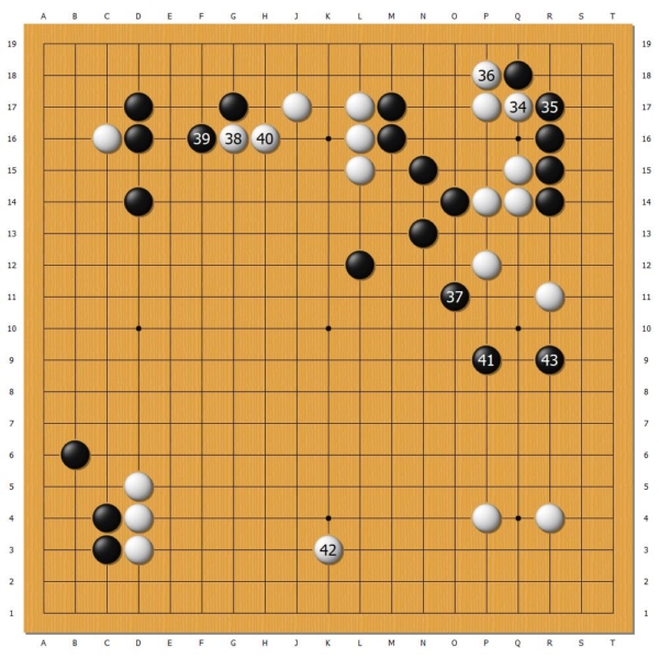 序盘,双方在上方短兵相接。白34、36两招阻渡,落下后手,黑37、41一边压迫白右上大龙,一边行棋在外,扩张外势,逐渐占据主动。党毅飞不希望被对手牵着鼻子走,白42抢占下边大场,主打一个“出其不意”。