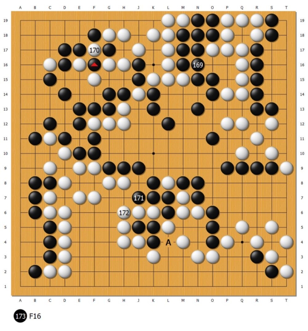官子阶段,双方在左上形成关键劫争,这是全盘仅存的变数。黑171找劫,白172黏,错失良机。AI认为,白可于A位提掉黑三子,尽管局部略有亏损,却可消掉黑棋“劫库”大患,将简明获胜。
