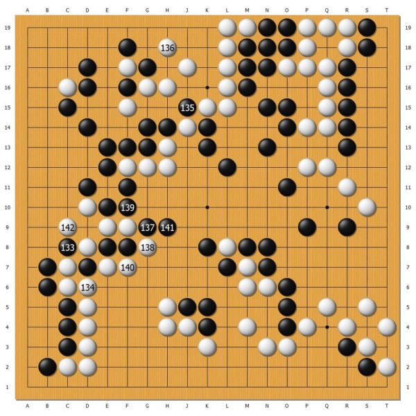 申真谞对于这种忽弱忽强的“非常规战法”颇为不适,行棋思路受到影响,中盘连续弈出疑问手。黑137扳,更是出现严重误算,被白142打吃,破掉左边许多实空,胜率发生逆转,几乎成为本局败著。
