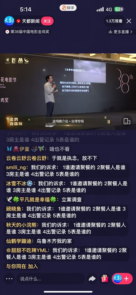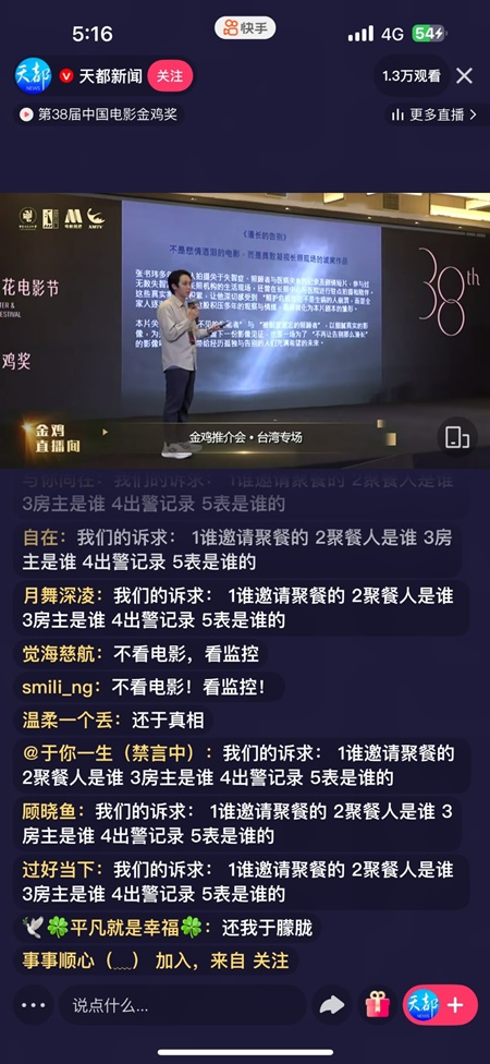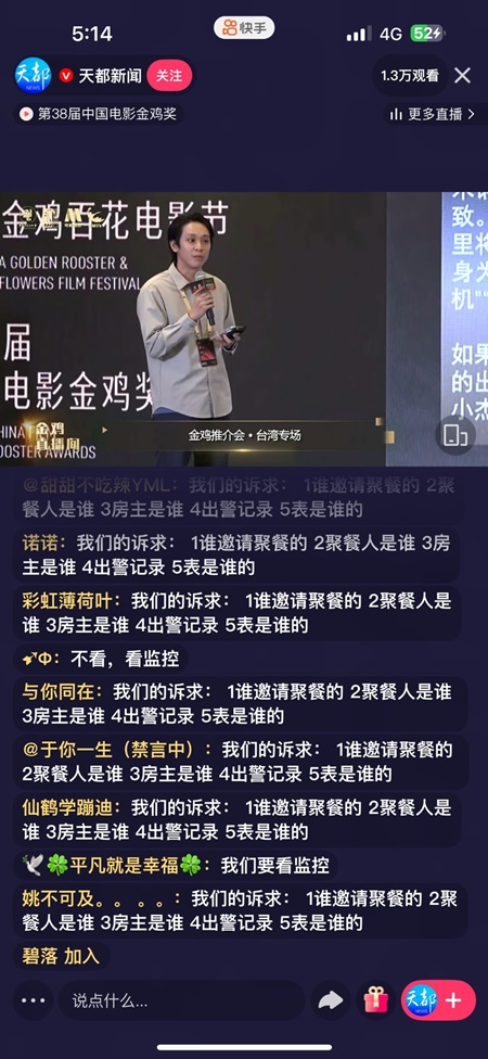 【新唐人北京时间2025年11月14日讯】中国男星于朦胧离世已两个多月,案件扑朔迷离,黑幕重重,大陆网友始终没有放弃为其追讨真相的机会。日前,在大陆第38届中国电影金鸡奖的直播间,留言区被网友灌爆,满版都在追讨于朦胧之死的真相。