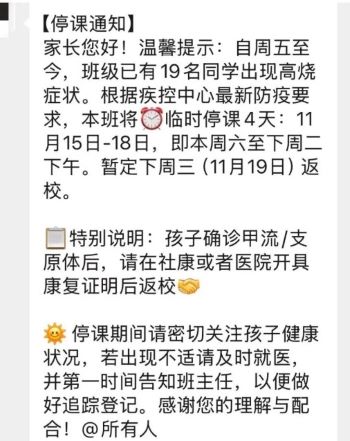 有广州的学生家长反映,自家孩子所在班级里,生病请假的学生人数几乎占全部人数的一半,因此班级已经停课,让学生们在家中上网课。还有不少深圳的学生家长也反映说,这波流感太凶猛,孩子班里生病请假的人很多,已收到了学校发来的停课通知。