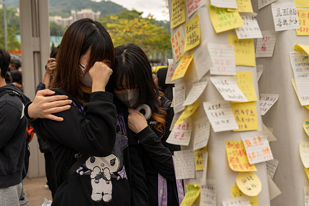 在宏福苑大楼附近,许多香港民众自发地摆放鲜花悼念遇难者,不少人掩面而泣。不少民众写下纸条悼念,有人更写下“人祸”,控诉这场大火背后是香港政府不作为,监管不力,工程使用不阻燃的防护网,酿成悲剧。