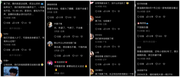 “于回来我们就看。”“让他回来,我们的钱就愿意花给娱乐圈。”“有多少兄弟姐妹9·11后直接恨透娱乐圈 有人赚得盆满钵满 有人没车没房甚至命都没了 看透了 我们终于醒悟了!”