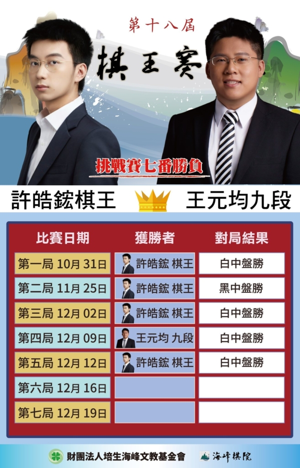 【新唐人北京时间2025年12月13日讯】第18届棋王挑战赛七番胜负第五局今(12)日落幕,现任棋王许皓鋐在比赛中展现无比韧性,在挑战者的优势局面下,许皓鋐的官子功夫滴水不露,最终在小官子阶段以半目之差成功逆转,迫使对手弃子投降,从而以4:1的总比分战胜王元均九段,成功卫冕棋王头衔,再度抱走120万元奖金,并创下棋王四连霸纪录!