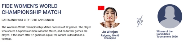 国际棋联(FIDE)候选人赛每两年举行一次,是通往女子世界冠军的必经之路,也成为各国名将角逐的焦点。2026年,候选人赛冠军将有资格挑战现任女棋王——居文君(Ju, Wenjun)。