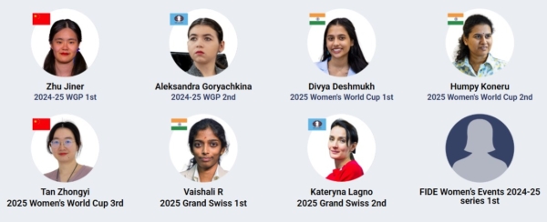 根据FIDE于12月17日统计,女子系列赛累计积分前七名,都已透过其它渠道取得了候选人赛资格,她们是: