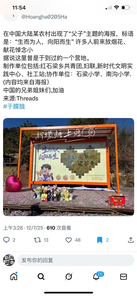 【新唐人北京时间2025年12月24日讯】中国男星于朦胧离世已3个月,他的支持者仍坚持追讨真相。这期间,海内外支持者用各种方式向中共当局提出要求立案的诉求。截至12月24日,全球有超73万人声援他。