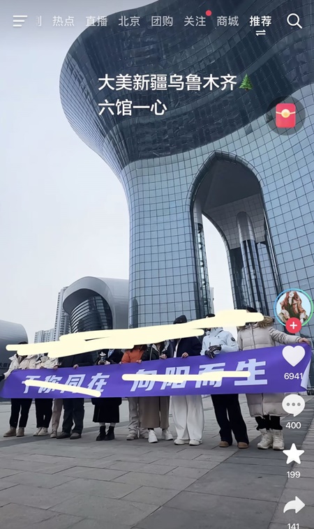 于朦胧粉丝在新疆乌鲁木齐“六馆一心”文化中心,打出“于你同在,向阳而生”的横幅。