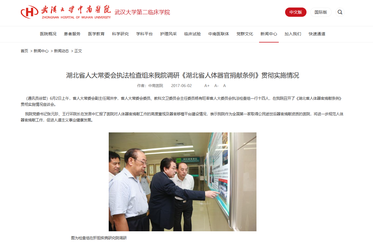 武汉大学中南医院武汉大学第二临床学院的官网上,2017年6月2日一篇报导说,时任院长王行环汇报了医院对人体器官捐献工作的高度重视及器官移植平台建设情况。(网页截图)