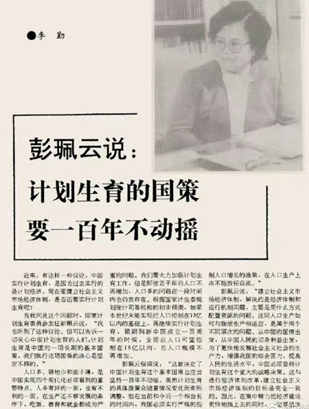 据路透社12月25日报导,中共从1980年至2015年执行了所谓的“一对夫妇只生一个孩子”的政策。彭珮云于1988年至1998年任中共国家计划生育委员会主任,这也是中共利用最严酷的手段执行“一胎化”政策的高峰时期。