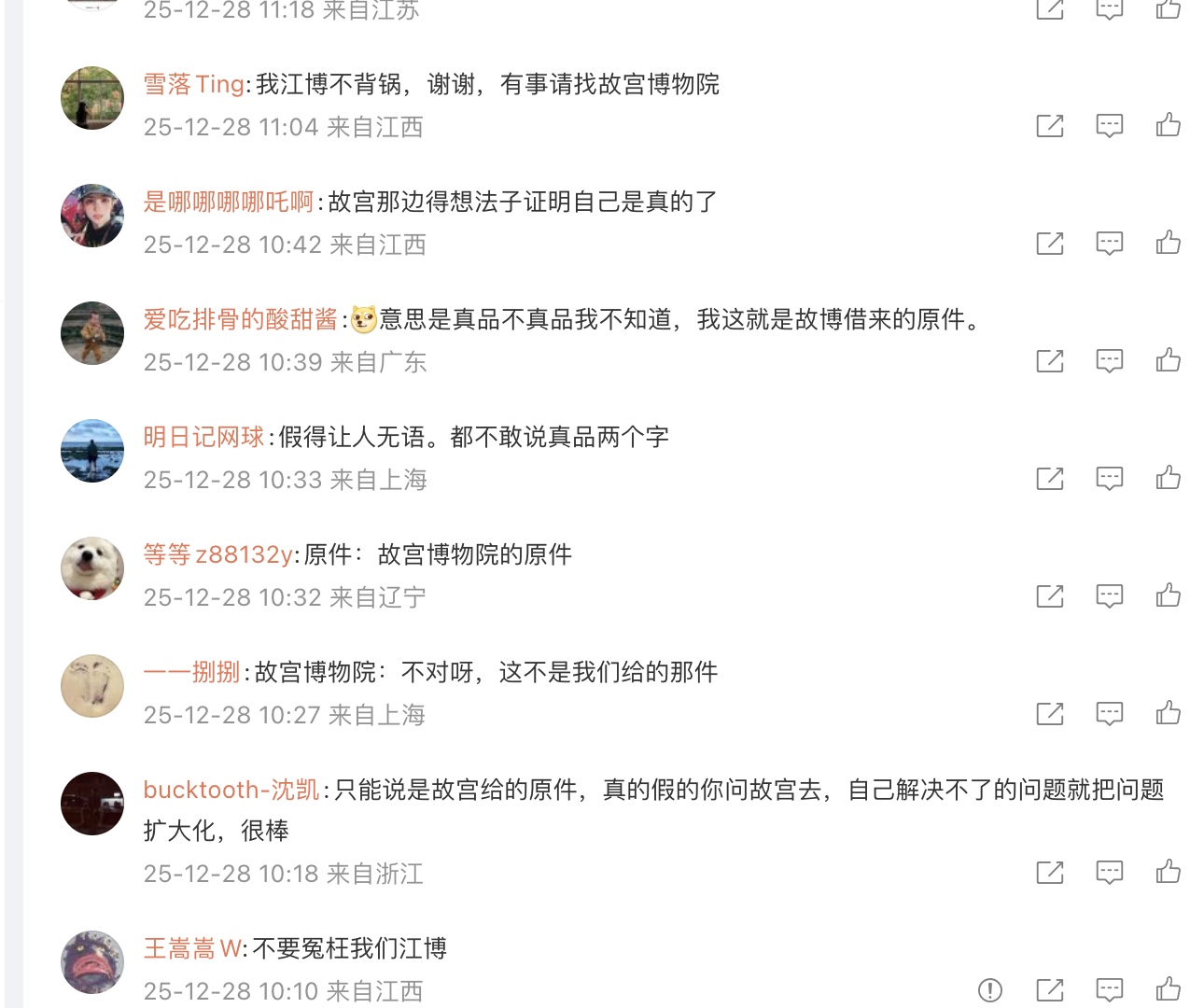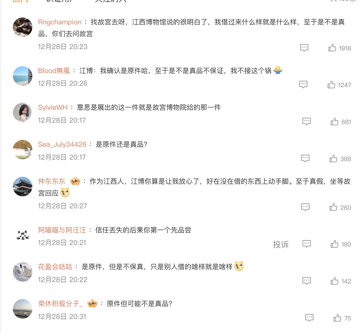 网友评论说,“这个声明有水平,只确认是原件,但不确认是真品。因为米芾展品是从故宫博物院借来展出的。江西省博只保证借来啥样,展出就是啥样。但是不是真的,江西省博不负责”“连个章子也没有,我也能发”“找故宫去呀,江西博物馆说的很明白了,我借过来什么样就是什么样,至于是不是真品,你们去问故宫”。