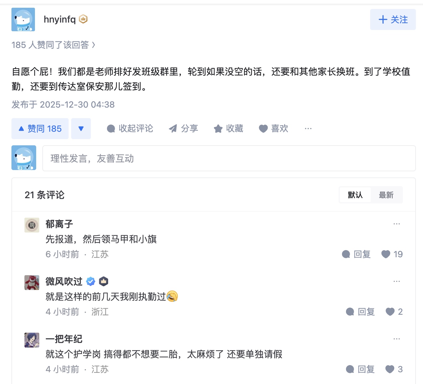 “如果不参与,那就各种给孩子下绊子,很多家长敢怒不敢言,只有提前请假、调休,专门为了护学岗调整自己的工作时间。”