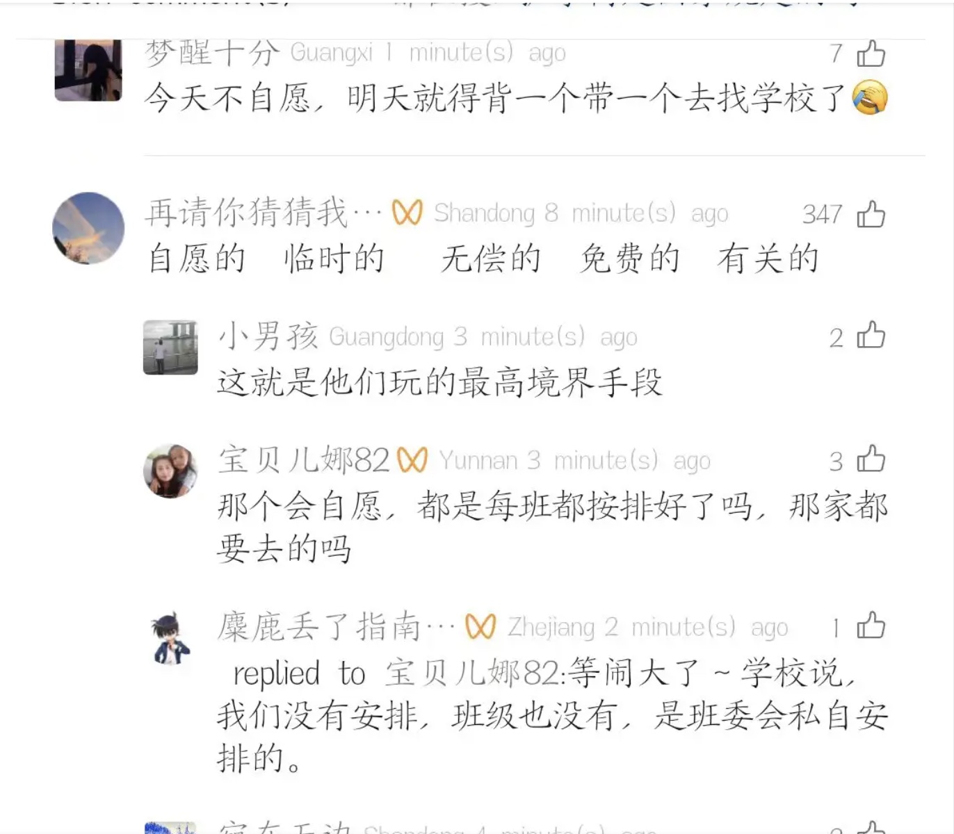 “搞出来护学岗,学生们在校门口出事了,这是家长的责任,学校和老师校长无责。而家长出事了,又一句‘自愿’甩锅。”