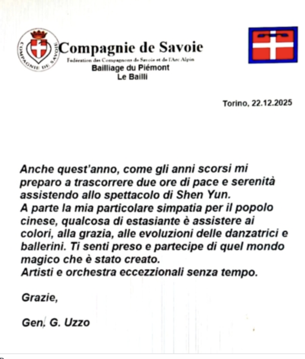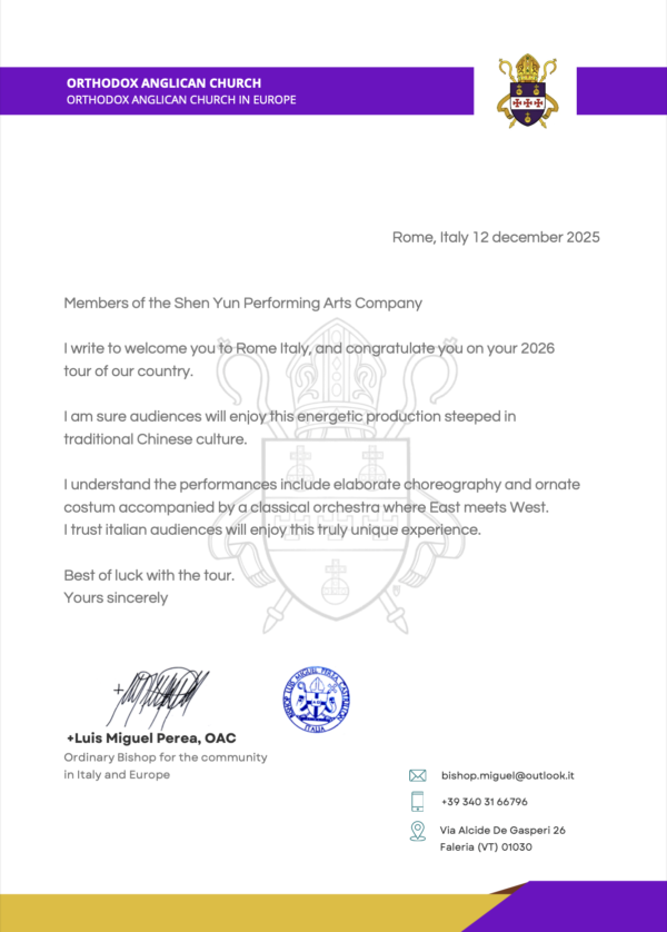 今年恰逢神韵成立20周年,意大利政要纷纷对莅临当地的神韵纽约艺术团献上美好的祝福。继罗马第十二市议会副主席皮特兰杰洛·马萨罗(Pietrangelo Massaro)之后,罗马市议员费德里科·罗卡(Federico Rocca),意大利陆军退役将领、皮埃蒙特大区萨伏依协会主席约瑟夫·乌佐(Giuseppe Uzzo)先生,意大利独立圣公会的主教路易斯·米格尔·佩雷亚(Luis Miguel Perea)等纷纷发来贺信,祝贺神韵2026演季意大利巡回演出的开始。
