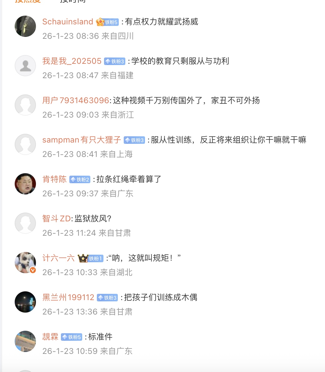 该视频的评论区中,有很多网友吐槽,“把孩子们训练成木偶”“流水线从娃娃抓起”“进行服从性测试”。