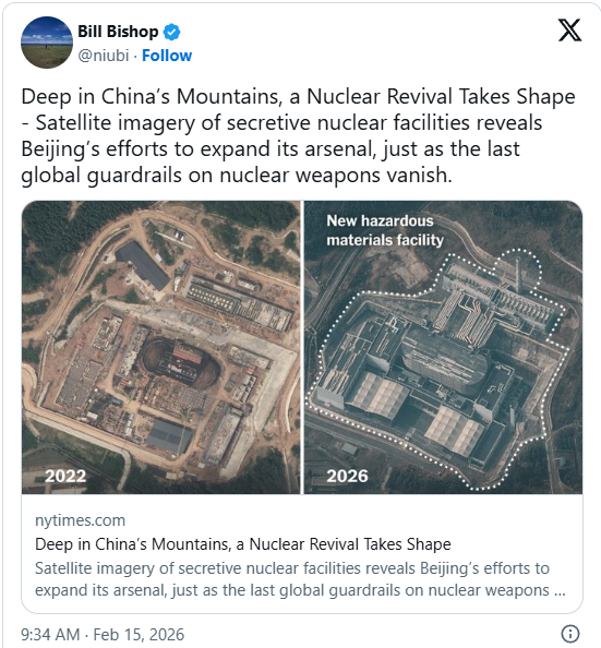 【新唐人北京时间2026年02月19日讯】美国政府一名高级官员,日前在公开场合透露了中共高度疑似进行地下核试爆的新细节。此前,被美国媒体曝光的一份卫星图片则显示,在四川绵阳附近深山密林中,一个核武基地正在进行大规模扩建。