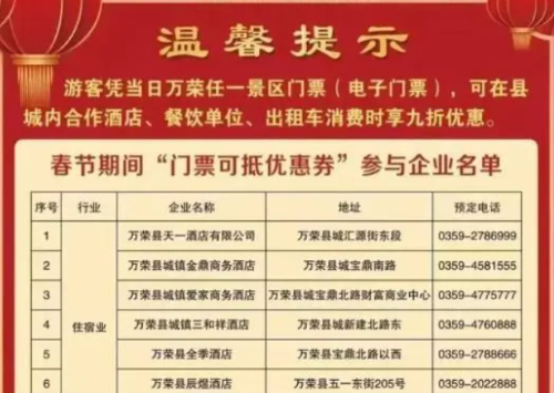 根据“万荣融媒”2月13日发布的公告,节日期间游客凭万荣县任意景区门票、电子门票,可在县域内合作酒店、餐饮单位、出租车消费时享九折优惠。这则消息下面罗列了所有参与“优惠”活动的企业名单,并刊发了万荣县工科局、万荣县文旅局对游客及民众的祝词,暗示这次优惠活动是这两个单位主办的。