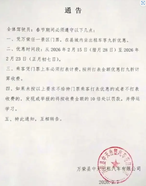 万荣县中天出租汽车有限公司2月7日发布的一份《通告》,明确要求所有出租车司机,从2月15日到2月23日期间,乘客凭景区门票上车的,必须打表计费,并按照打表金额打九折收费。被发现或被举报未按规定执行者,“将按收费金额的10倍处以罚款,并停运学习”。