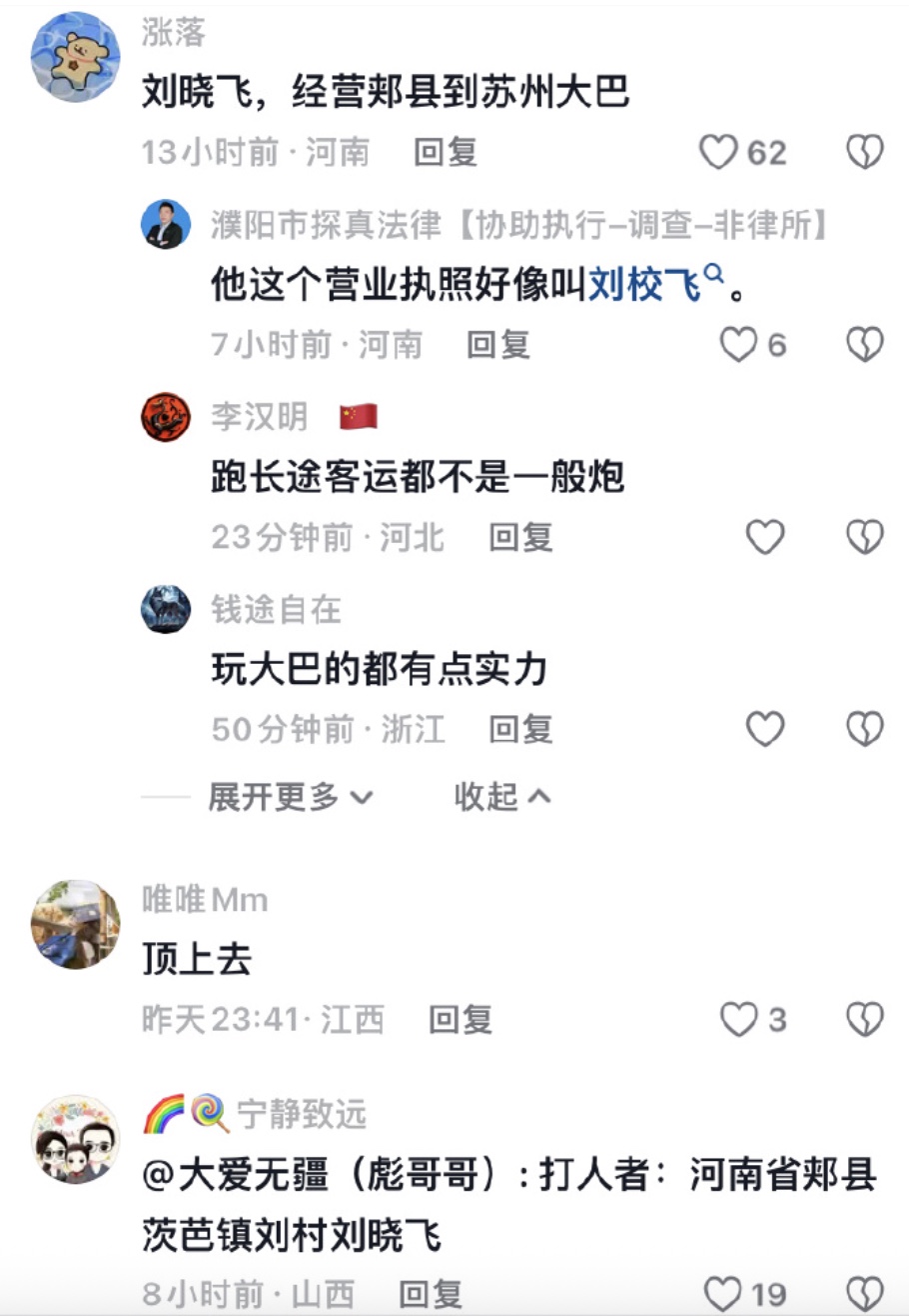 当地网友发帖揭示,行凶者刘晓飞在当地经营大巴车业务,之前还开设赌场,与当地官方关系密切,还有网友透露其凶手背后保护伞是其舅舅杨占奇,杨占聚。