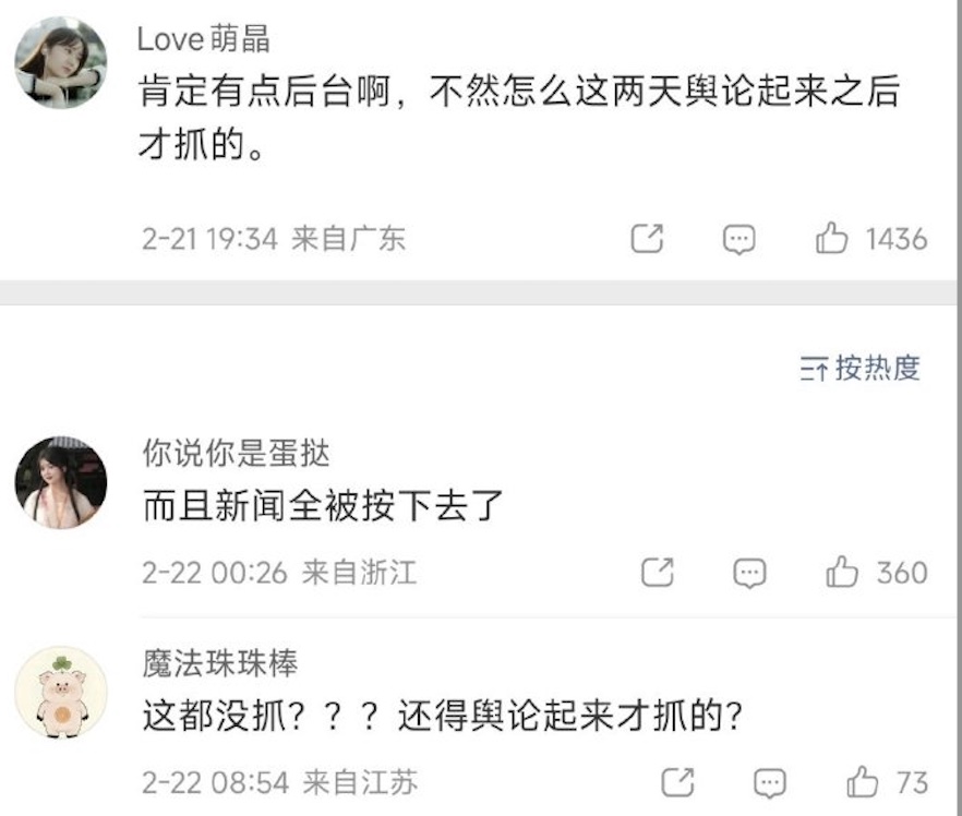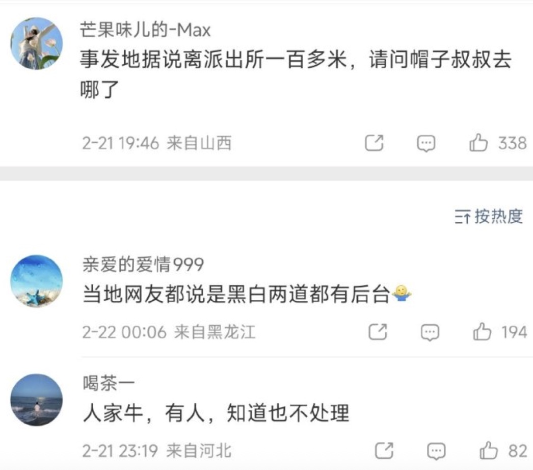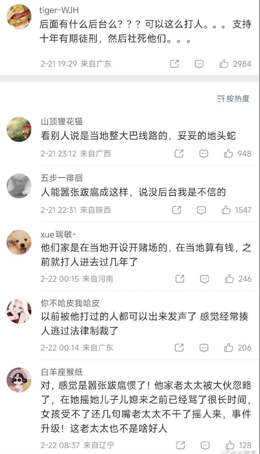 网友评论说,“上热搜,压不住了,才不得不抓人。之前当地都是忙着删帖,压热搜,没有硬后台,根本不可能的”,“亏的有视频证据,女孩子吓得不敢还手,但凡回手了,以这家人的能量,当地的通告估计都得改成‘互殴’”,“还是有点后台的哦!两天后才通报”。