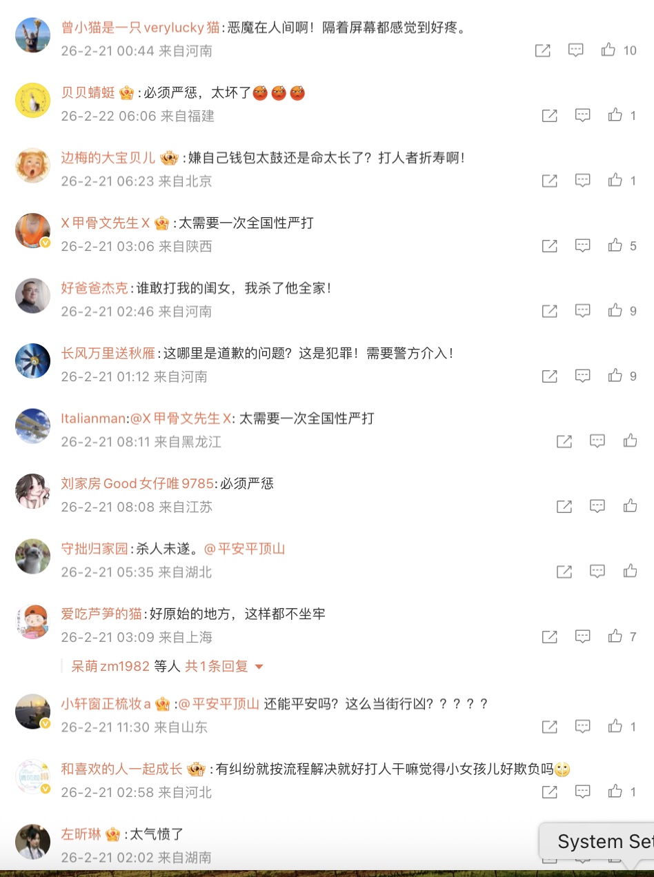“对未成年人如此施暴,法理难容、人心难平!”“必须严惩,还孩子一个公道”“典型的黑社会,怪不得平顶山警方不回应,平时估计没少收好处”“无耻,太暴力了,一个大老爷们打小姑娘”“这一家子是黑社会吗?无法无天了”“就是当街行凶。谁啊,这么狂”“必须严惩,太坏了”“太气愤了”。