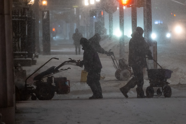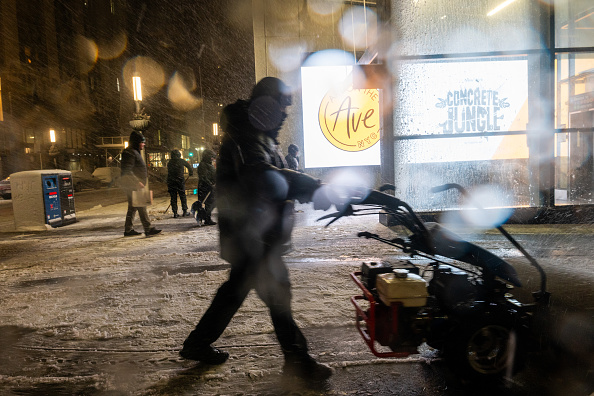 2026年2月22日,在纽约市,一名市民正在使用吹雪机,该市正严阵以待,准备迎接周日至周一的暴风雪。(Spencer Platt/Getty Images)