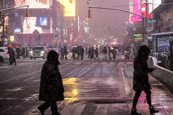 2026年2月22日,纽约市曼哈顿时代广场上,人们在雪中漫步。(CHARLY TRIBALLEAU / AFP via Getty Images)