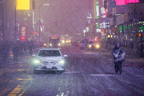 2026年2月22日,纽约市曼哈顿时代广场下雪,一名行人骑车经过。(CHARLY TRIBALLEAU / AFP via Getty Images)