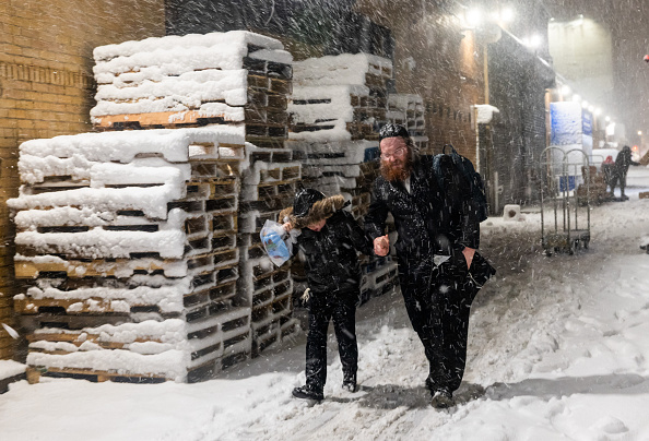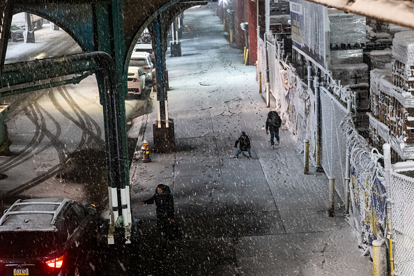 2026年2月22日,暴雪席卷纽约市布鲁克林区,人们走在街上。(Spencer Platt/Getty Images)