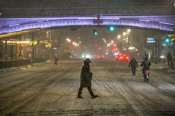 2026年2月22日,纽约市长佐兰·马姆达尼宣布全市进入紧急状态并实施旅行禁令后,一名女子在中央车站过马路。(Ryan Murphy/Getty Images)