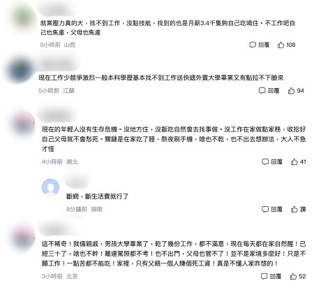 “就业压力是真的大,找不到工作,没点技能,找到的也是月薪3、4千,只够自己吃喝住。不工作吧自己也焦虑,父母也焦虑。”