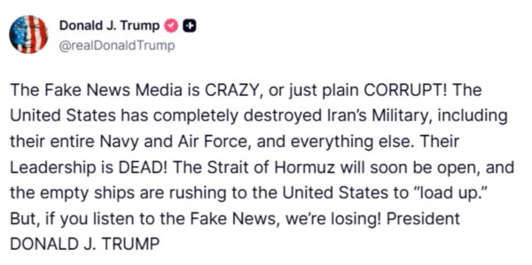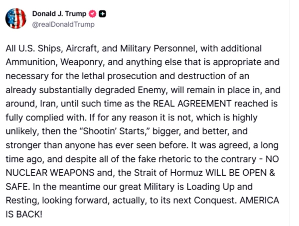 他指出虚虚实实的停火状态必须停止,他写道:“如果出于任何原因未能遵守(尽管可能性极小),那么‘战斗’将以前所未有的规模、力度和强度展开。尽管存在种种相反的虚假言论,但共识在很久以前就已达成:不能拥有核武器,霍尔木兹海峡将保持开放和安全。”